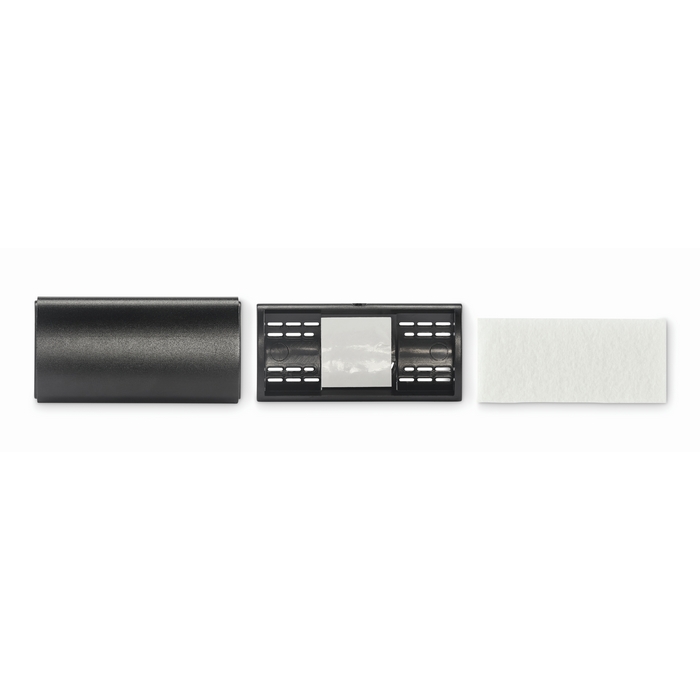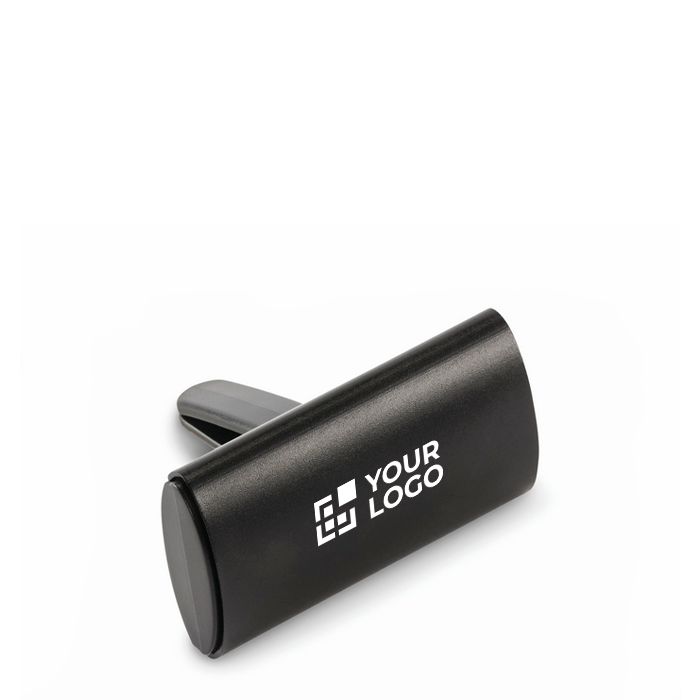 Ambientador de coche con tapa de aluminio y clip de ABS, pensado para colocar en la rejilla de ventilación de forma estable. Incorpora un inserto de fieltro RPET diseñado para aplicar líquido aromatizante, que no se incluye. El formato compacto facilita su uso en flotas, vehículos de empresa o regalos de fidelización. Una opción práctica para campañas de marca en concesionarios, talleres ó rent a car