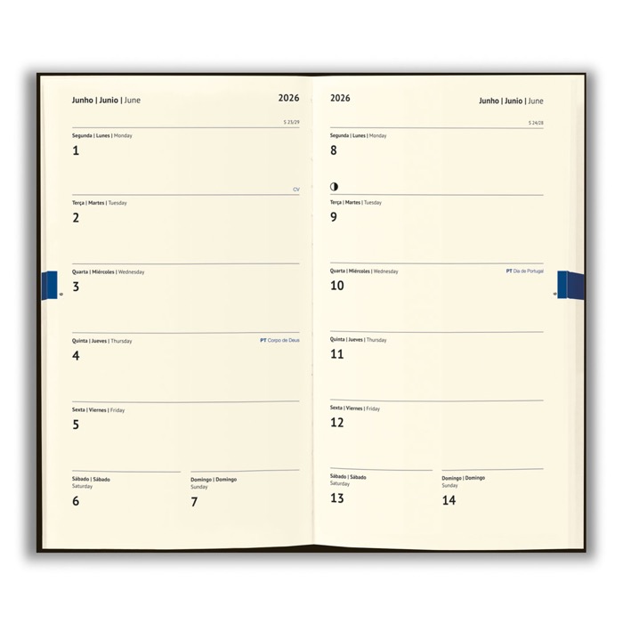 Una agenda bisemanal con tapas de corcho, en formato de bolsillo, te ofrece una planificación compacta y ecológica para llevar contigo. Con detalles en marfil, su diseño bisemanal te permite tener una visión general de tus compromisos. Incluye un soporte para sujetar el bolígrafo, lo que facilita la toma de notas rápidas. Se suministra junto a una bolsa de tela non-woven, añadiendo un toque de distinción. Las hojas lisas de color marfil y el interior a 2 colores refuerzan su atractivo visual. Al ofrecer esta agenda, tu empresa proyecta una imagen moderna y consciente.