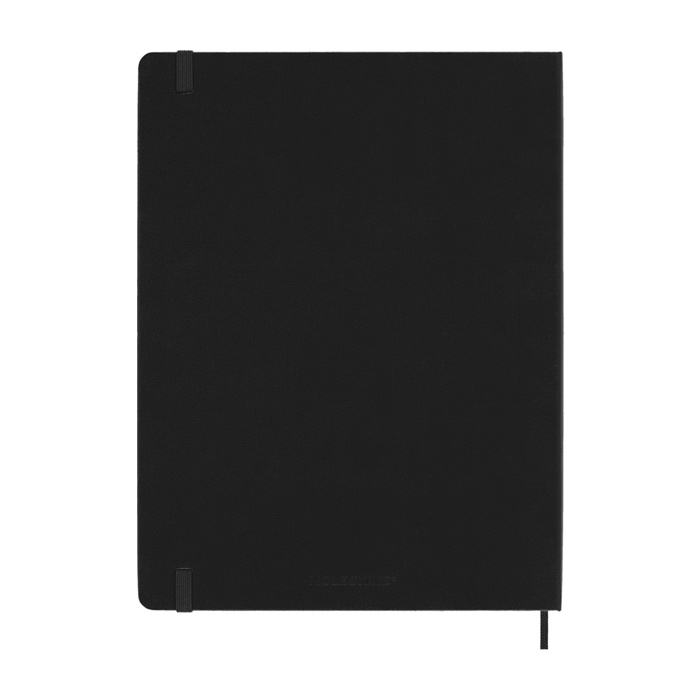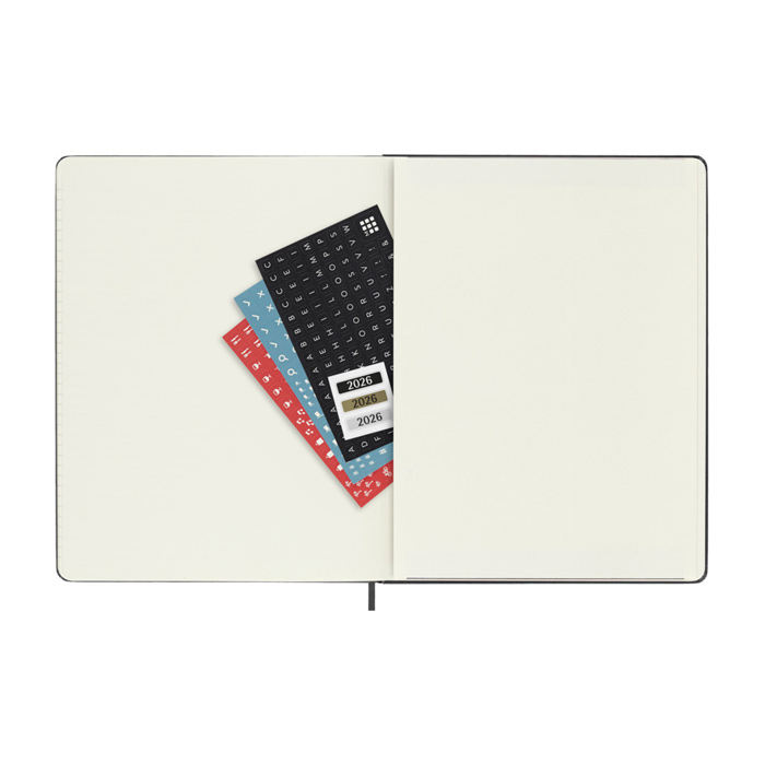 Fechada de enero a diciembre de 2026, la agenda semanal para 12 meses de tapa dura y tamaño XL ”Moleskine” muestra toda la semana de un vistazo, al tiempo que ofrece páginas con vista anual y mensual para una visión más amplia del año, seguidas de páginas para planificar viajes, ideas y objetivos. Los días de cada semana se muestran en una cara, mientras que la opuesta es una página rayada para tareas y notas. Incluye papel color marfil libre de ácidos, un cierre elástico negro, un marcapáginas de cinta, un bolsillo interior extensible de color a conjunto y adhesivos para la personalización, así como adhesivos del año para el lomo.