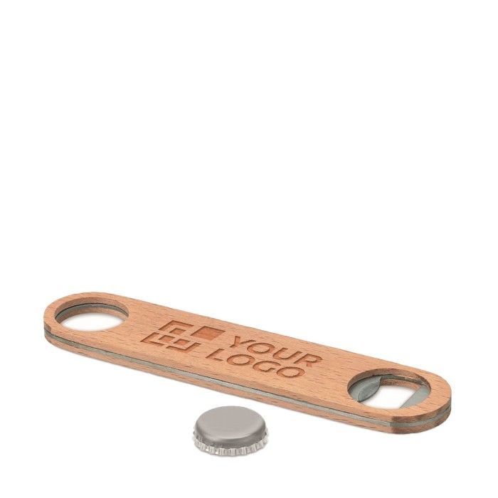 Abridor de madera serigrafiado alargado con logotipo Metalwood