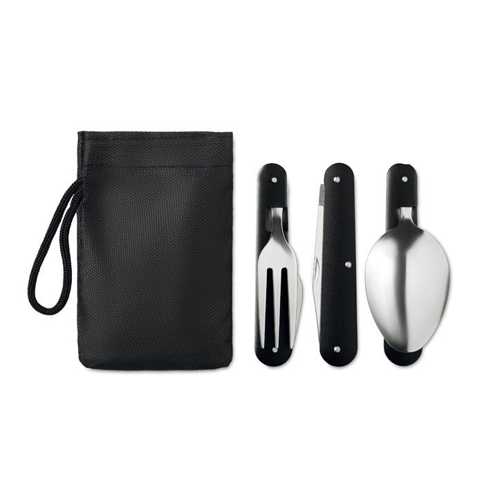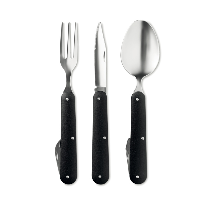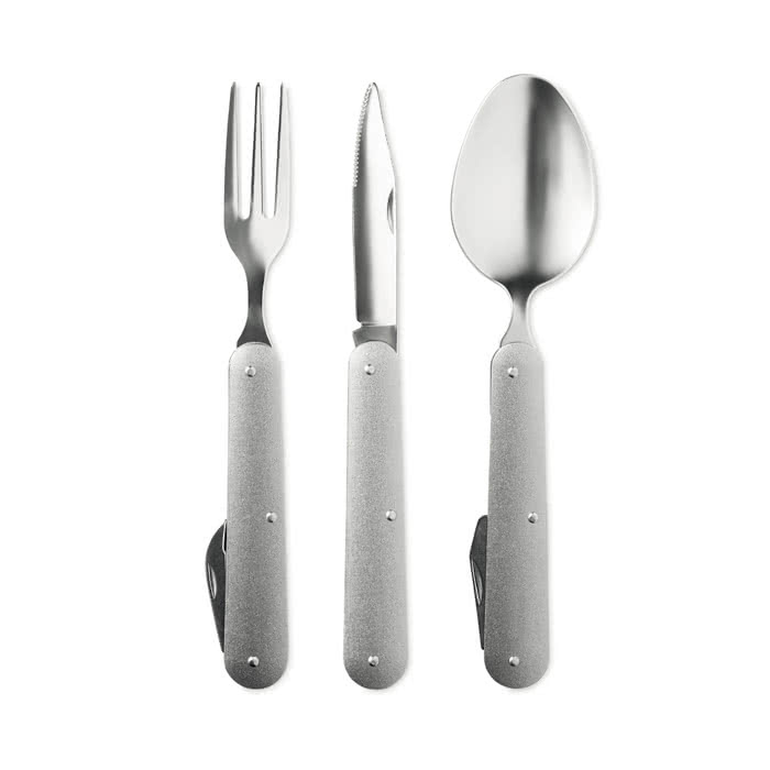 Set de 3 cubiertos promocionales plegables de acero para camping Inox