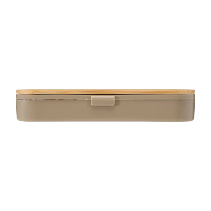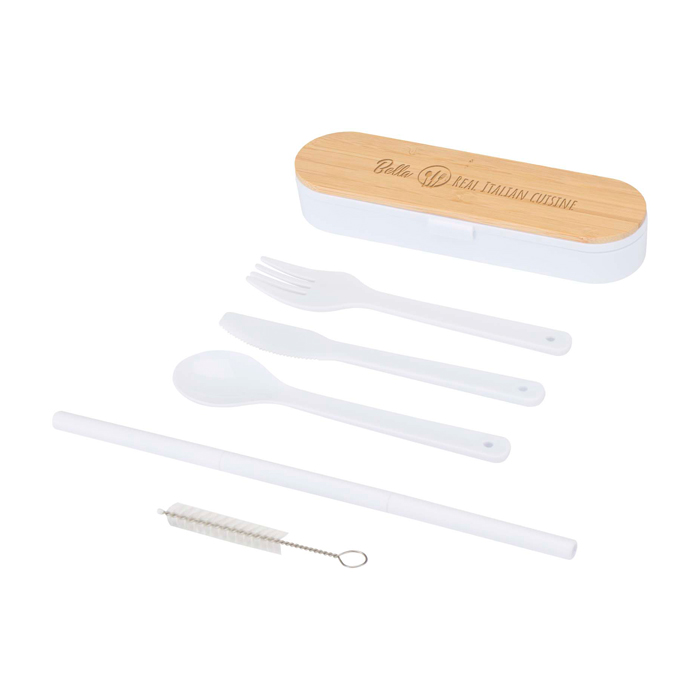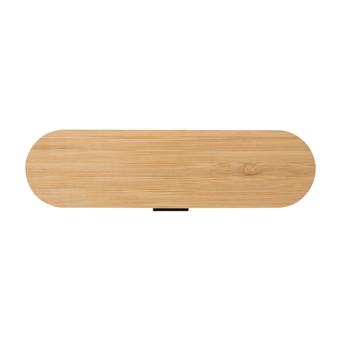 Juego de cubiertos reutilizables presentado en una caja de plástico con tapa de bambú, pensado para comidas fuera de casa. Incluye tenedor, cuchillo, cuchara, pajita y limpiador de pajitas, para que el equipo tenga todo a mano sin depender de opciones desechables. Formato compacto, fácil de guardar en la bolsa o junto a la fiambrera. La limpieza es sencilla, tanto de los cubiertos como de la pajita. Opción práctica para acciones de oficina, eventos internos o campañas de marca con uso diario.