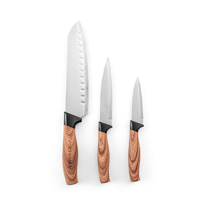 Juego de 3 cuchillos de cocina con hojas de acero inoxidable y mangos ergonómicos de plástico con acabado imitación madera. Incluye un cuchillo santoku para cortes generales, un cuchillo multiusos para tareas diarias y un cuchillo para pelar pensado para fruta y verdura. Se presenta en caja de regalo de papel kraft y cada set se suministra en funda de plástico para una entrega más protegida. Opción práctica para packs de bienvenida, regalos a clientes o incentivos internos.