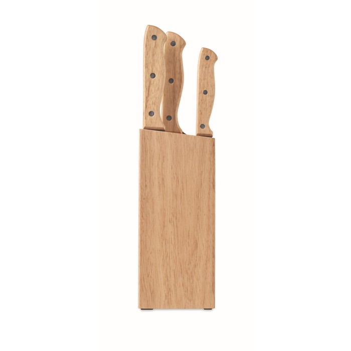 Un set de cuchillos de madera con soporte te ofrece una solución completa para las necesidades de cualquier cocina. Incluye cinco cuchillos: para Chef, de pan, rebanador, multifuncional y pelador. Cada cuchillo está diseñado para diferentes propósitos, asegurando versatilidad y eficiencia en la preparación de alimentos. Fabricados en acero inoxidable con mango de madera, garantizan durabilidad y un agarre cómodo. El soporte permite un almacenamiento organizado y una presentación atractiva. Al regalar este conjunto, tu marca se asocia con la calidad y la estética en el hogar, destacando tu compromiso con la organización y la excelencia.