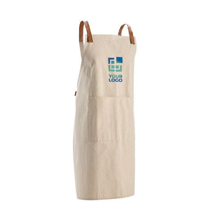 Delantal ecológico de 70x90 cm fabricado en algodón reciclado. Diseñado para la comodidad y funcionalidad, cuenta con dos bolsillos delanteros que facilitan el acceso a herramientas o utensilios esenciales durante la jornada laboral. Los detalles de cuero sintético (poliuretano) reciclado no solo añaden un toque de estilo, sino que también refuerzan su compromiso con la sostenibilidad. Con un gramaje de 280 g/m², ofrece una consistencia robusta y duradera. El embalaje en caja de cartón reciclado subraya su enfoque ecológico. Ideal para empresas que buscan integrar prácticas sostenibles en sus operaciones diarias o como parte de una estrategia de marketing verde.