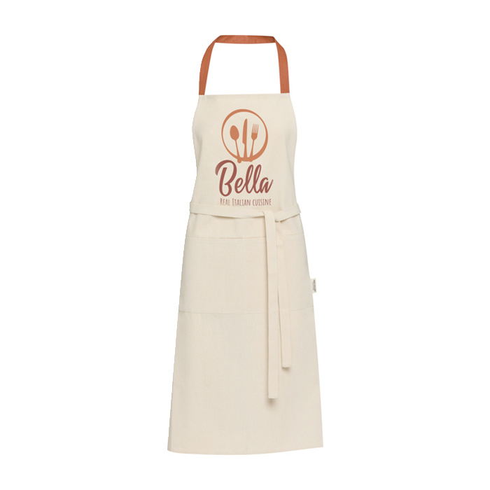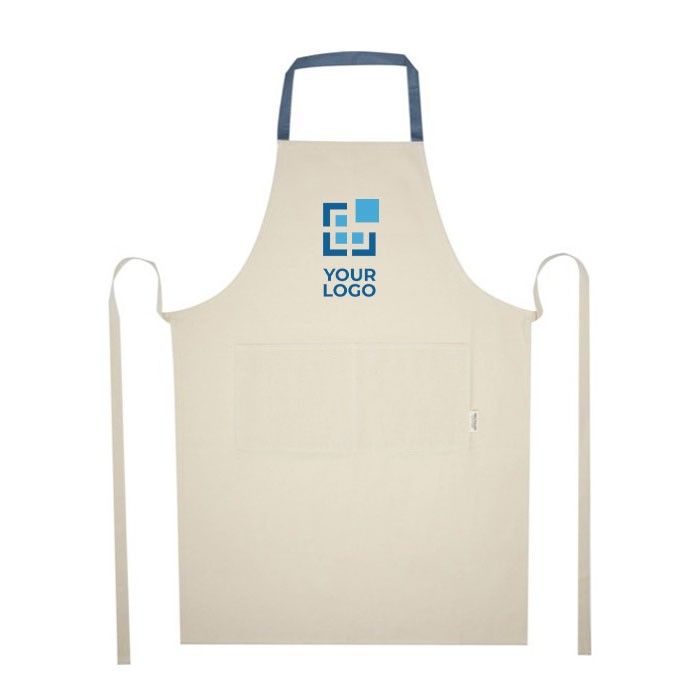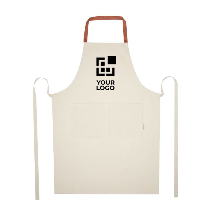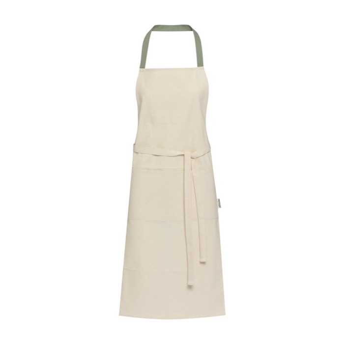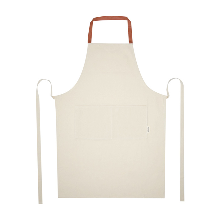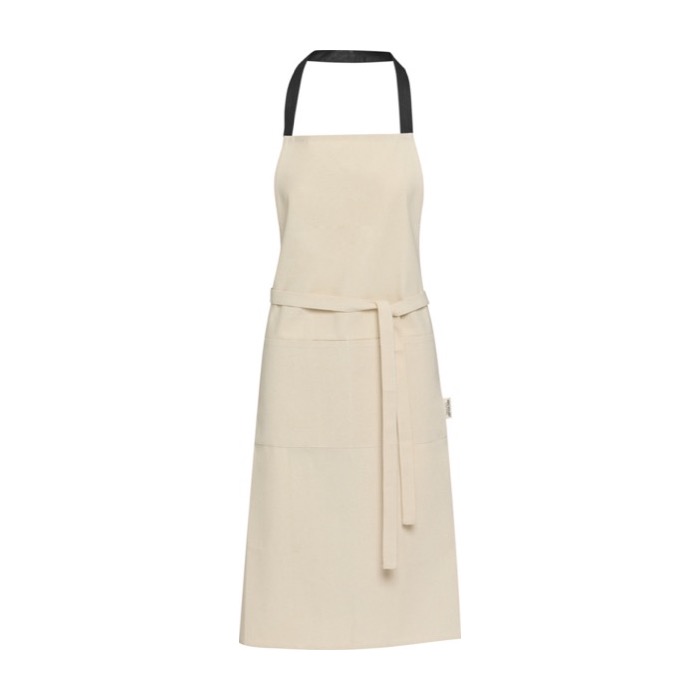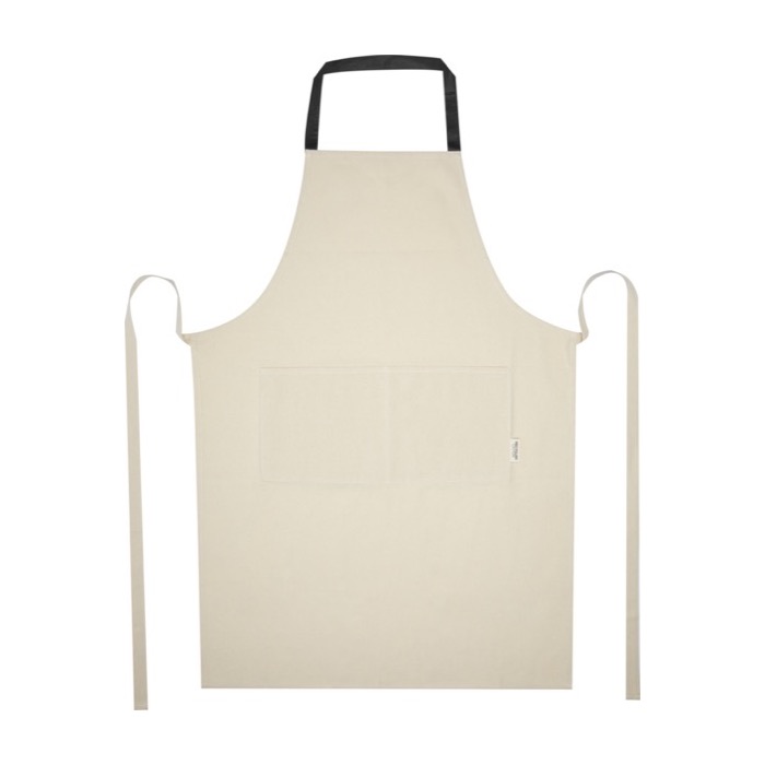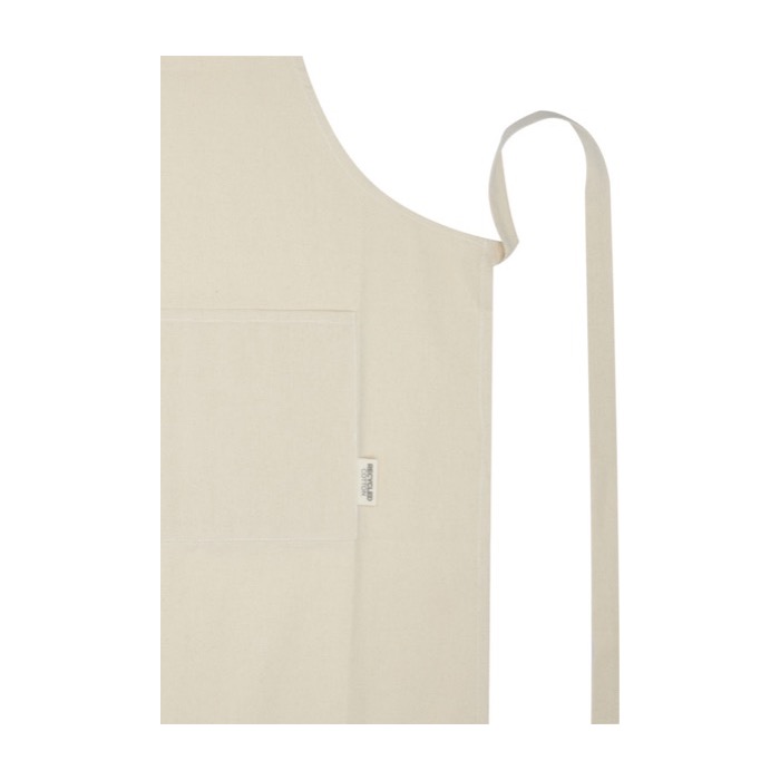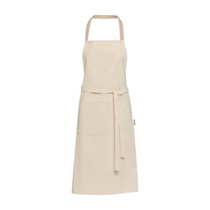 Delantal confeccionado en algodón reciclado 100 % de 210 g/m², con certificado Global Recycled Standard (GRS). Su diseño en color natural y la lazada en contraste al cuello ofrecen una protección eficaz para la ropa durante la preparación de alimentos. Equipado con dos bolsillos de un tamaño total de 45 x 20 cm, proporciona espacio suficiente para utensilios o herramientas de cocina. El cierre de lazo de 1 metro de largo asegura un ajuste cómodo y adaptable. Ideal para empresas que buscan productos sostenibles, este delantal es perfecto para eventos culinarios corporativos o como parte de una estrategia de marketing ecológica.