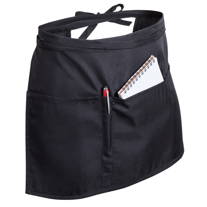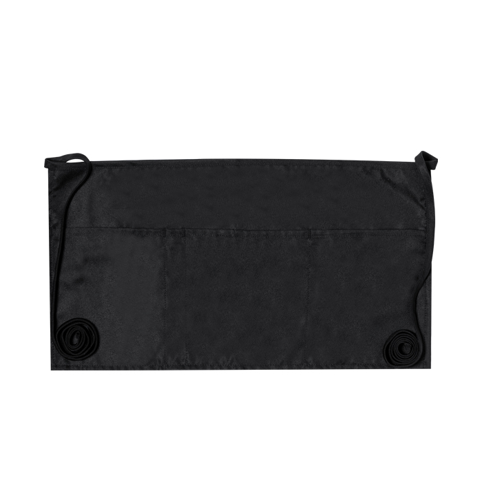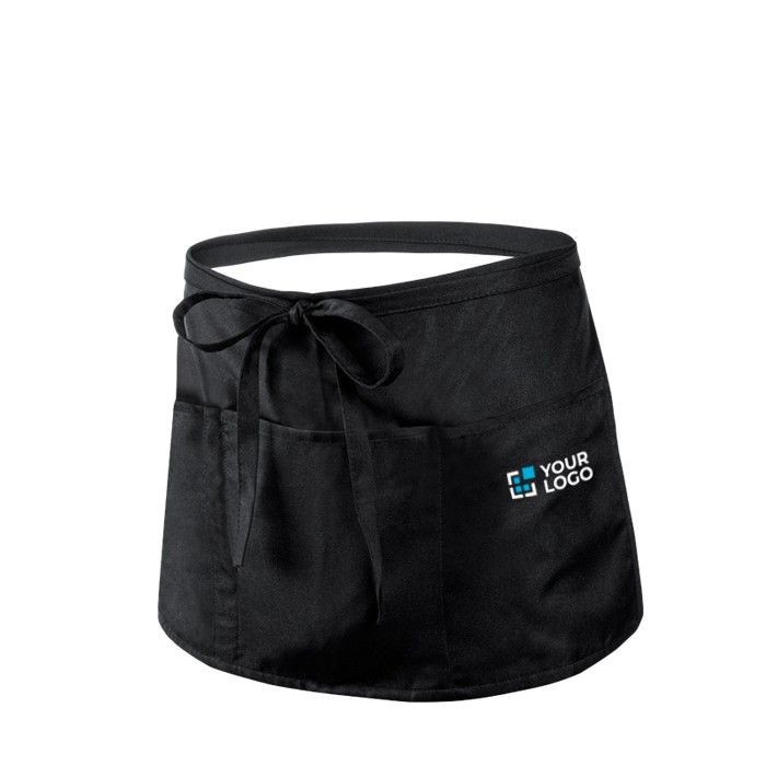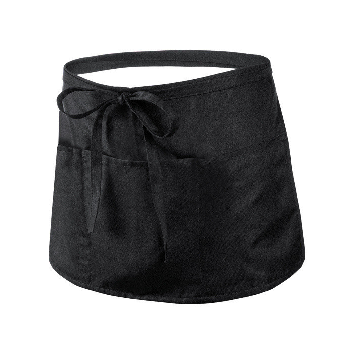Delantal para cintura fabricado en 100% poliéster, ofreciendo un acabado suave y elegante en color negro. Diseñado con dos bolsillos grandes y un bolsillo mediano, proporciona espacio suficiente para guardar utensilios esenciales. Incluye una funda para bolígrafo, ideal para tener siempre a mano. Las cintas ajustables aseguran un ajuste cómodo y personalizado para cada usuario. Perfecto para entornos de hostelería, este delantal no solo es práctico, sino que también puede ser una herramienta eficaz para reforzar la imagen de marca en eventos corporativos o ferias.