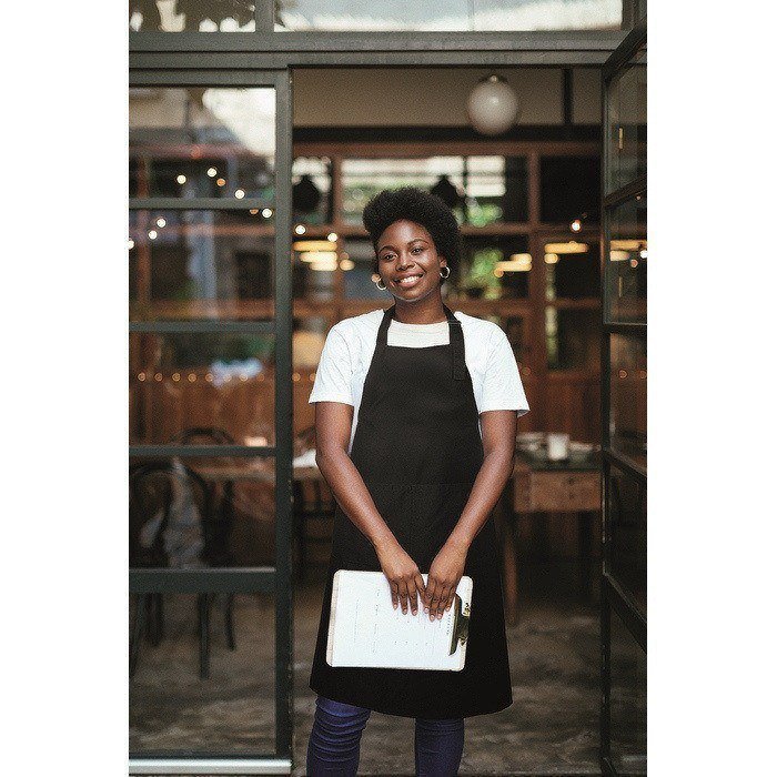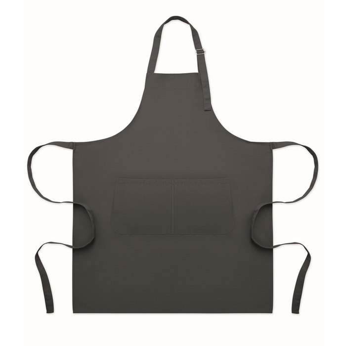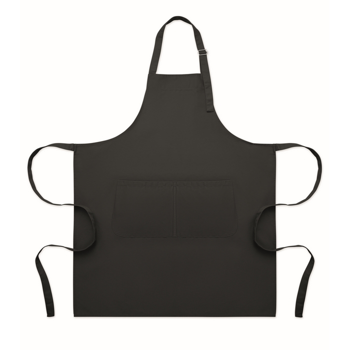 Delantal de cocina largo en polialgodón de 240 g/m² (35% algodón, 65% poliéster), pensado para un uso diario cómodo y ordenado. Incorpora dos bolsillos delanteros para tener a mano utensilios, bloc de notas o paños. La correa del cuello es ajustable y se fija con una hebilla metálica, facilitando el ajuste a distintas alturas. El tejido ofrece un buen equilibrio entre resistencia y mantenimiento sencillo. Adecuado para uniformar equipos en hostelería, eventos culinarios o acciones de marca.