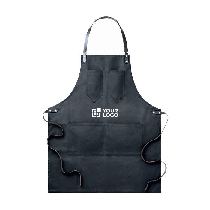 Delantal publicitario de lona con correas de piel y bolsillos BBQ