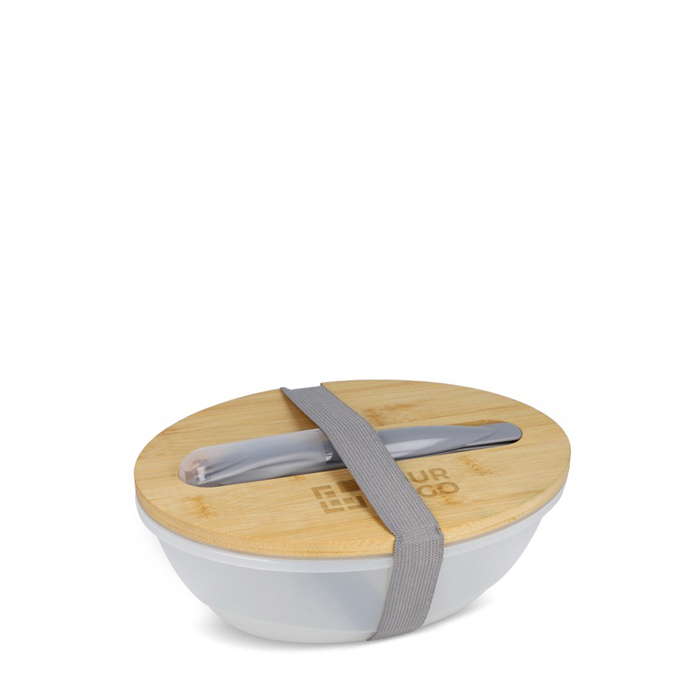 Fiambrera con tapa de bambú y juego de cubiertos con cierre elástico