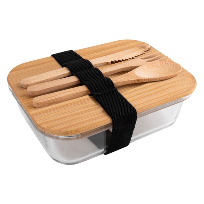 - Fiambrera de cristal con tapa y cubiertos de bambú