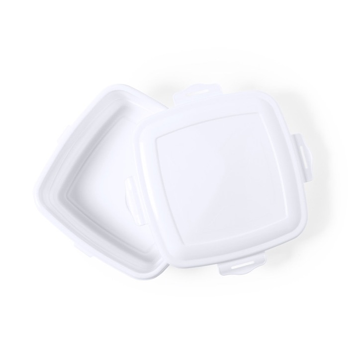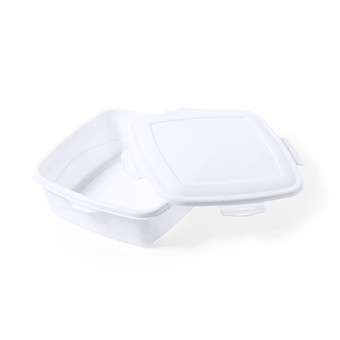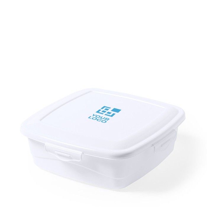 Fiambrera de 1L de capacidad, fabricada en polipropileno (PP) de color blanco. Este producto, de origen europeo, cuenta con certificación Food Grade, garantizando su seguridad para el contacto con alimentos. Su diseño cuadrado incluye un cierre de seguridad en todos sus lados, asegurando que el contenido se mantenga fresco y protegido. Además, es apta para su uso en microondas y lavavajillas, facilitando su limpieza y calentamiento. Ideal para empresas que buscan soluciones prácticas para que sus empleados lleven la comida al trabajo, pudiendo personalizarse con el logotipo corporativo para reforzar la identidad de marca.