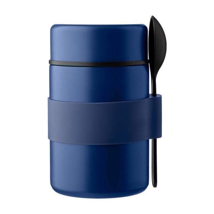 Recipiente termo de doble pared fabricado en acero inoxidable, con una capacidad de 460 ml, ideal para mantener la temperatura de tus alimentos. El interior está hecho de acero inoxidable 304, conocido por su resistencia a la corrosión, mientras que el exterior es de acero inoxidable 201, que ofrece durabilidad y un acabado elegante. Incluye una práctica cuchara de polipropileno (PP) negra, sujeta con una tira de silicona a juego, lo que facilita su transporte y uso. La tapa también es de PP, asegurando un cierre hermético. Presentado en una caja de cartón marrón, es perfecto para empresas que buscan una solución práctica para comidas en movimiento. Ideal para personalizar con el logo de tu empresa y utilizar en eventos corporativos o como regalo promocional.
