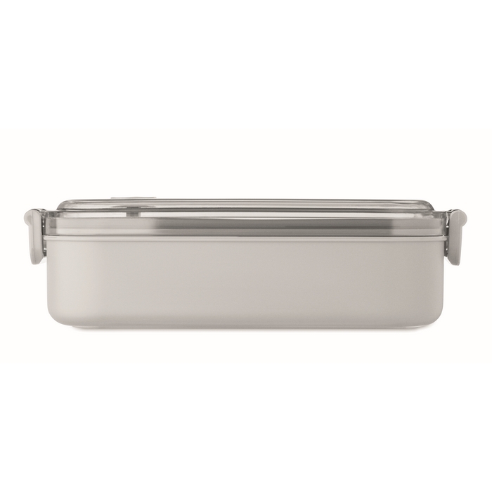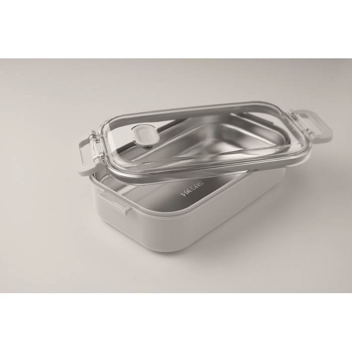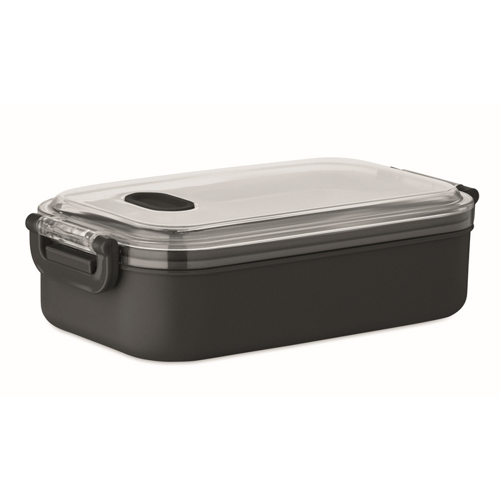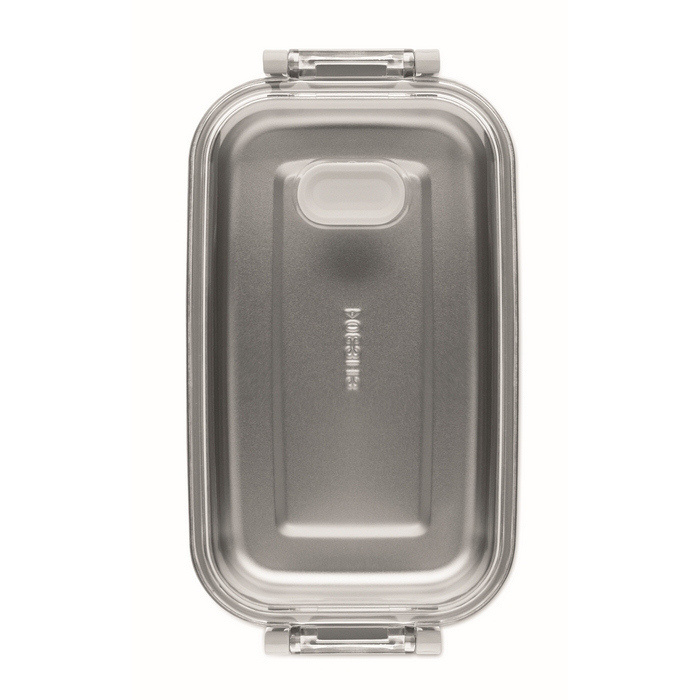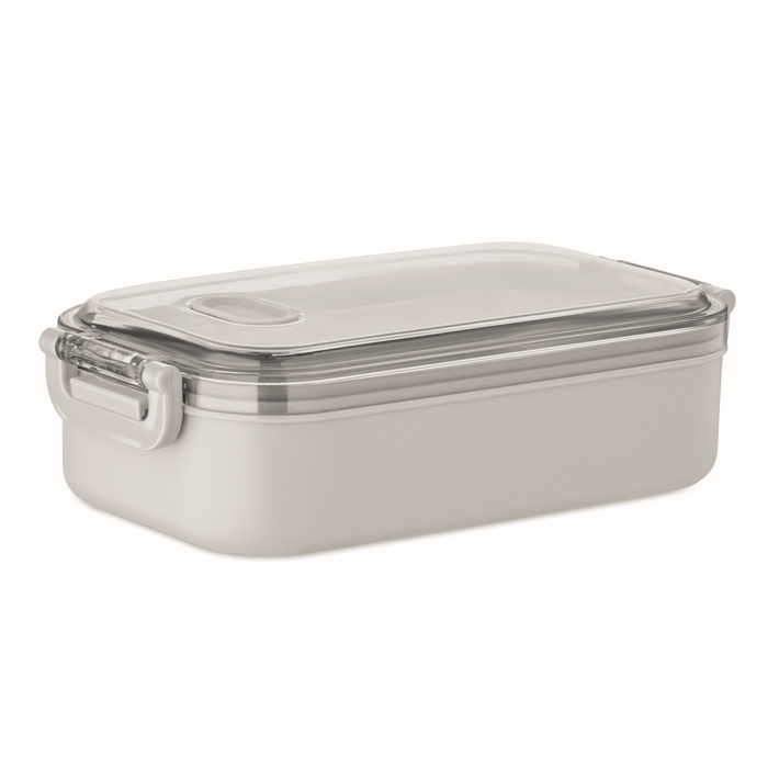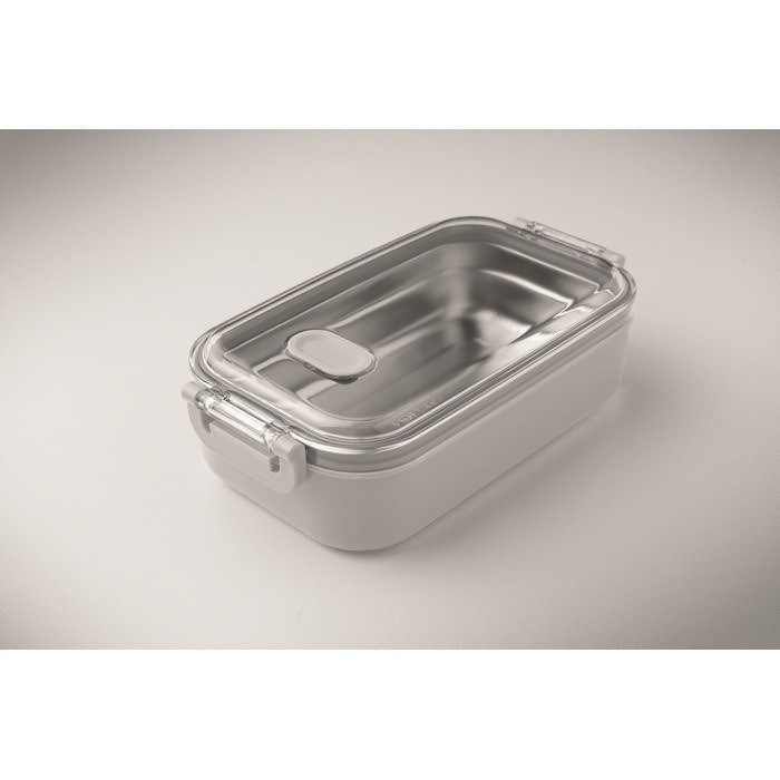Fiambrera de plástico con una capa interior adicional de acero inoxidable reciclado, pensada para transportar comida de forma práctica en el día a día. Incorpora tapa hermética de AS que ayuda a mantener los alimentos frescos y seguros durante el traslado. Ofrece 750ml de capacidad. Opción adecuada para comedores de empresa, packs de bienvenida o acciones internas de marca.