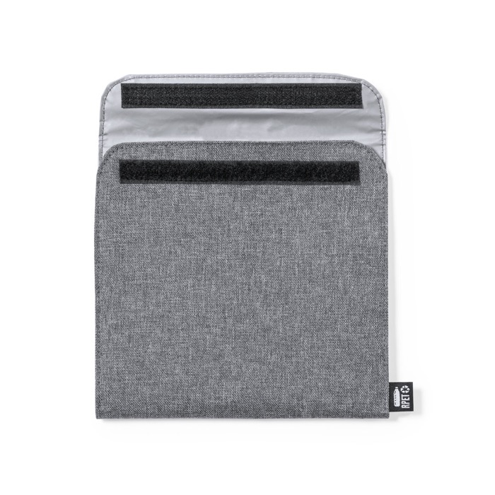 Portasnacks térmico fabricado en poliéster 600D RPET, un material sostenible elaborado a partir de plástico reciclado. El interior isotermo en PEVA mantiene la temperatura de los alimentos, asegurando su frescura durante más tiempo. El cierre de velcro facilita un acceso rápido y seguro, mientras que la etiqueta exterior con distintivo "RPET" destaca su compromiso con el medio ambiente. Este portasnacks en color gris es ideal para transportar desayunos o almuerzos a la oficina, reduciendo el uso de materiales desechables como el aluminio. Perfecto para empresas que buscan soluciones prácticas y sostenibles para sus empleados.