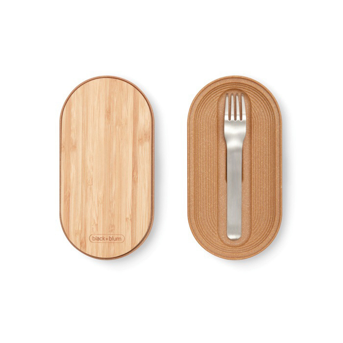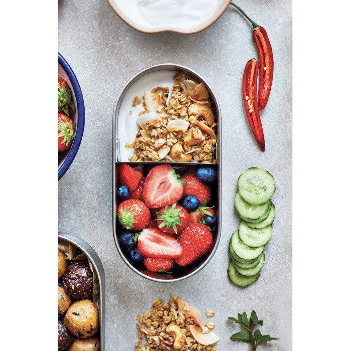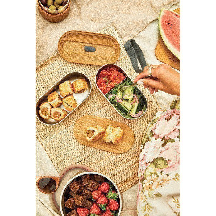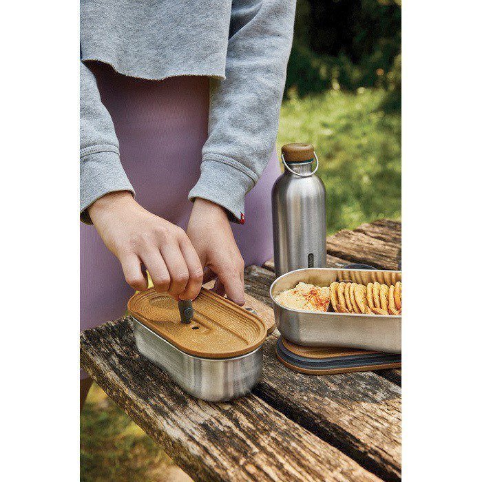 Set de recipientes de acero inoxidable con volumen total de 1000ml. pensado para comidas rápidas en oficina o desplazamientos. Incluye dos envases de 500ml. 100% herméticos. y un separador deslizante de acero inoxidable para mantener ingredientes separados sin complicaciones. La tapa de bambú funciona también como tabla de cortar y guarda un tenedor integrado para comer en cualquier lugar. Desarrollado junto a Sara Kiyo Popowa (Bento Power). incorpora cinco recetas exclusivas. Útil como regalo corporativo para equipos. eventos o campañas de bienestar.