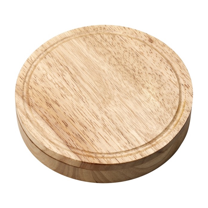 Set para cortar quesos con tabla de madera en estuche circular