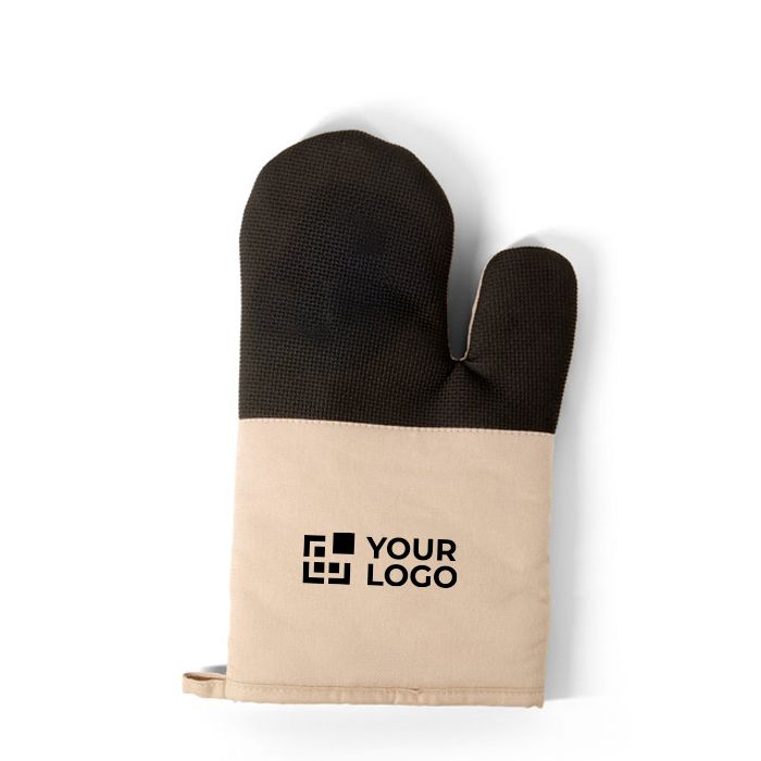 Guante de cocina de algodón con silicona en un lado para mejorar el agarre al manipular utensilios calientes. El tejido ofrece un tacto cómodo para el uso diario, mientras la zona de silicona ayuda a reducir deslizamientos al sujetar bandejas, cazuelas o fuentes. Diseño pensado para uso práctico en cocinas profesionales, salas de descanso o eventos de empresa con servicio de catering. Opción adecuada para personalizar y utilizar en campañas de merchandising corporativo o packs de bienvenida.