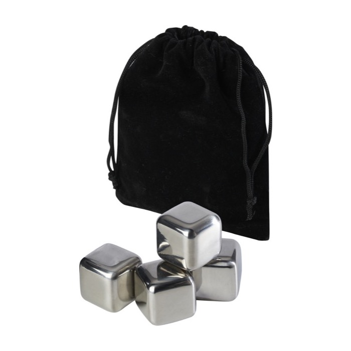 Un juego de 4 cubitos de hielo reutilizables de acero inoxidable te permite ofrecer una forma elegante de enfriar bebidas. Estos cubitos enfrían las bebidas de forma rápida y eficaz, manteniendo tus cócteles o refrescos a la temperatura perfecta sin alterar su sabor. Disfrutarás de una experiencia de degustación superior. Presentados en una bolsa de terciopelo, este regalo distinguido asocia tu marca con la calidad y la sofisticación. Tu logotipo, presente en este set, reforzará tu imagen en momentos de ocio y celebración, creando una impresión duradera de buen gusto y practicidad.