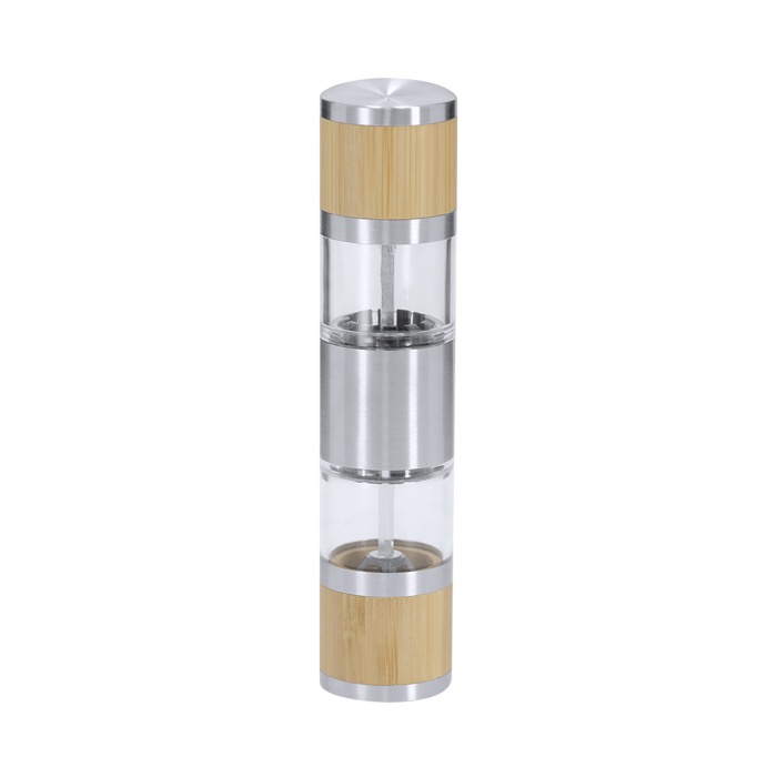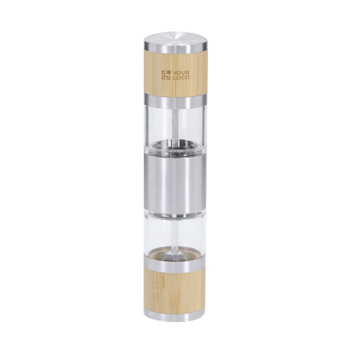 Molinillo manual para sal y pimienta en bambú y acero inoxidable, pensado para uso diario en cocina o sala. Integra dos compartimentos independientes, uno para cada condimento, y facilita cambiar de sabor sin usar dos piezas distintas. Cada cámara incorpora un molinillo cerámico interno con ajuste manual de grosor, para elegir entre molienda fina o más gruesa según el plato. La ventana lateral permite controlar el nivel de carga de un vistazo. Opción práctica para regalos de empresa en hostelería o acciones de marca en alimentación.
