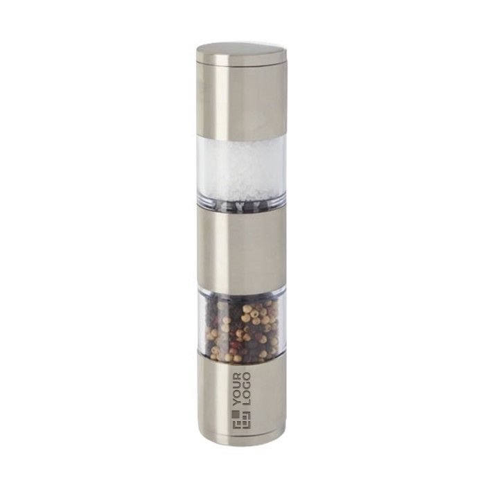 Optimiza el espacio en la cocina de tus clientes con un molinillo de dos extremos. Este utensilio práctico, personalizado con tu logotipo, permite tener ambos condimentos esenciales a mano en un solo dispositivo. Aunque la pimienta y la sal no están incluidas, su diseño innovador facilita su uso en talleres de cocina, kits de bienvenida o eventos del hogar. Así, tu marca se asocia con la eficiencia y la innovación, reforzando la percepción de tu empresa como proveedora de soluciones útiles y modernas.