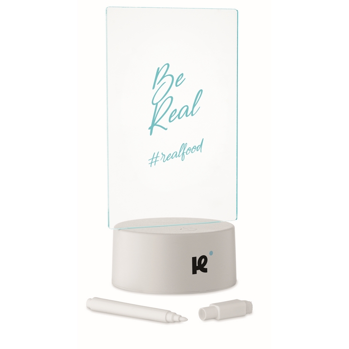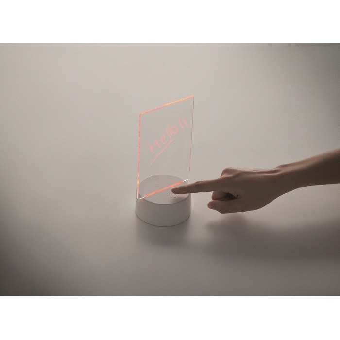 Pizarra de notas LED de acrílico con base de aluminio, pensada para escribir y borrar mensajes de forma rápida. Incluye rotulador blanco borrable y ofrece iluminación con cambio de color para que las anotaciones se vean mejor en entornos con poca luz. Funciona con 3 pilas AAA (formato de pila estándar) no incluidas, lo que facilita su uso sin cables en mostradores o mesas. Opción práctica para señalización interna, recepciones, promociones en punto de venta o eventos corporativos.