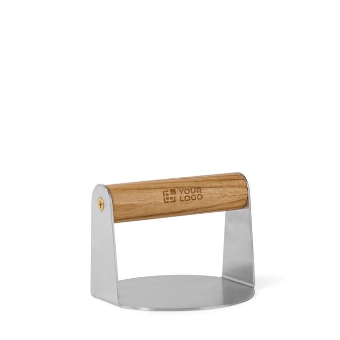 Una prensa para hamburguesas de acero inoxidable y asa de madera es un utensilio de cocina robusto que puedes ofrecer en eventos de team building o como obsequio para clientes del sector gastronómico. Con un diámetro de 11 cm, permite preparar hamburguesas a la parrilla de manera uniforme. Fabricada en acero inoxidable de primera calidad, garantiza durabilidad. El asa de madera de fresno con certificación FSC® asegura comodidad en su uso. Tu marca, asociada a la calidad y la precisión culinaria, se fortalecerá al vincularse con la excelencia en la cocina.