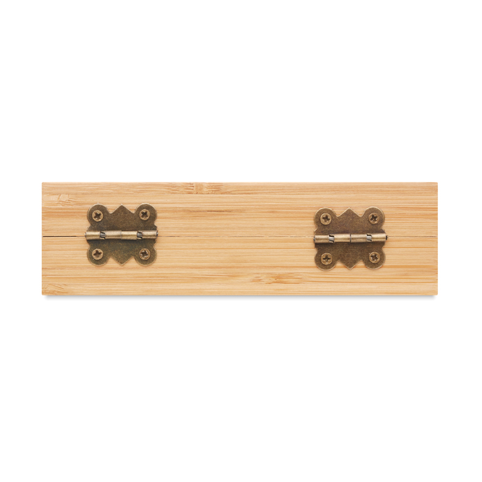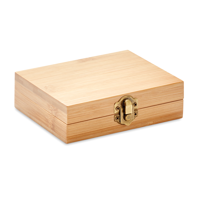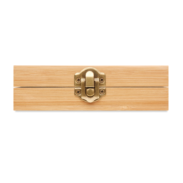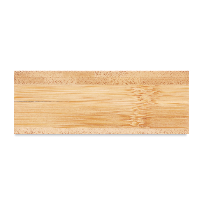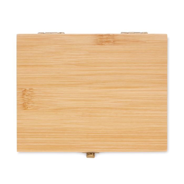 - Permite personalizar tanto la tapa de la caja contenedora de bambú como los vasos de vidrio.