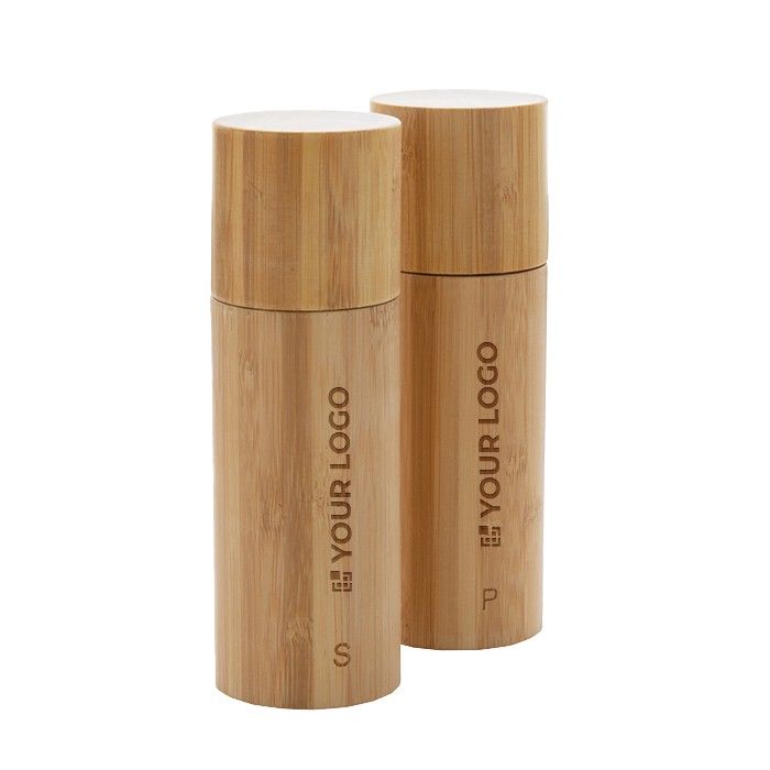 Aporta elegancia a la mesa de tus clientes con unos molinillos de sal y pimienta grandes, con exterior de bambú y mecanismo cerámico. Este set, presentado en una caja de regalo Kraft y con tu logotipo, combina estilo y calidad. Los molinillos tienen una capacidad de 110ml, lo que reduce la necesidad de rellenarlos frecuentemente, y están grabados con una 'P' y una 'S' para facilitar su uso. Tú lo puedes ofrecer como obsequio premium a clientes VIP, en eventos de diseño de interiores o en campañas de fidelización. Así, tu marca se asocia con el buen gusto, la calidad y la sostenibilidad. Cada uso realzará tu presencia en un contexto cotidiano y sofisticado.