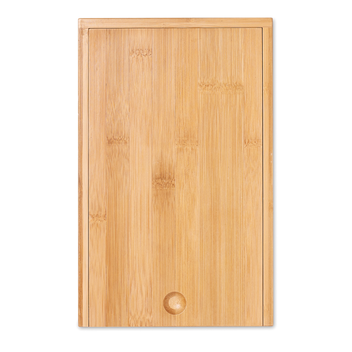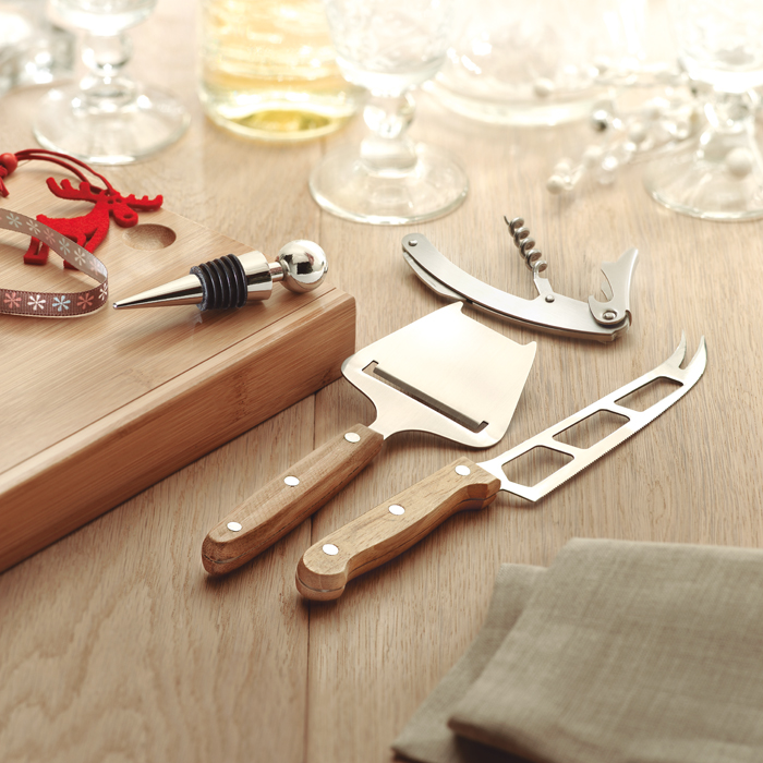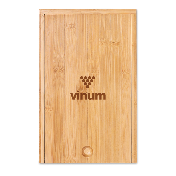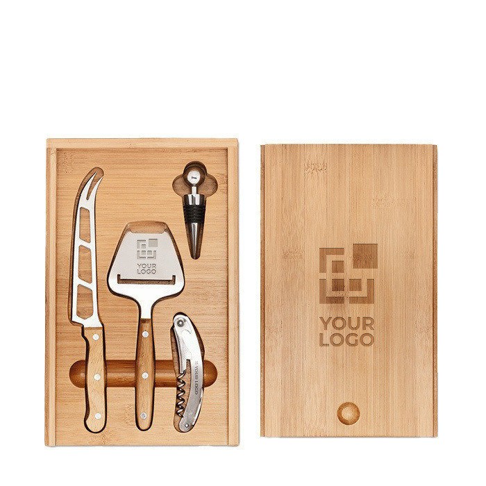 Set ideal para amantes del queso y el vino, presentado en un elegante estuche de bambú que aporta un toque natural y sofisticado. Incluye cuchillo y rallador de acero inoxidable, así como sacacorchos y tapón a juego, todo lo necesario para disfrutar de una experiencia completa. Su cuidada presentación lo convierte en una excelente opción como regalo de empresa o detalle personalizado, combinando utilidad, diseño y una estética cálida. Podrás elegir entre personalizar alguno de los accesorios o la propia caja, dependiendo del resultado deseado.