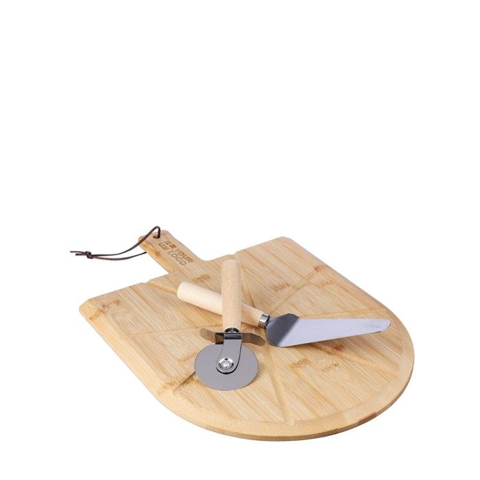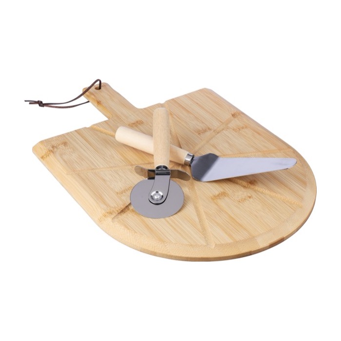 Una tabla de pizza de bambú con asa y guías de corte es un regalo que puedes ofrecer en eventos corporativos. Incluye un cortador de acero inoxidable y madera de haya, y una espátula, facilitando la preparación y el servicio de pizza. El cordón de cuero sintético en el mango permite colgarla fácilmente, optimizando el espacio. Presentada en una caja de cartón marrón, este set de 3 piezas asocia tu marca con momentos de disfrute, reforzando la lealtad y el recuerdo de manera cercana y positiva.