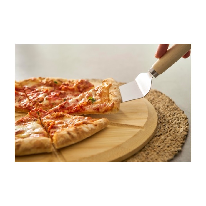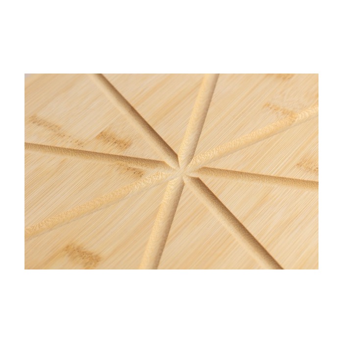Tabla de pizza de bambú con guías de corte y un cortador y espátula