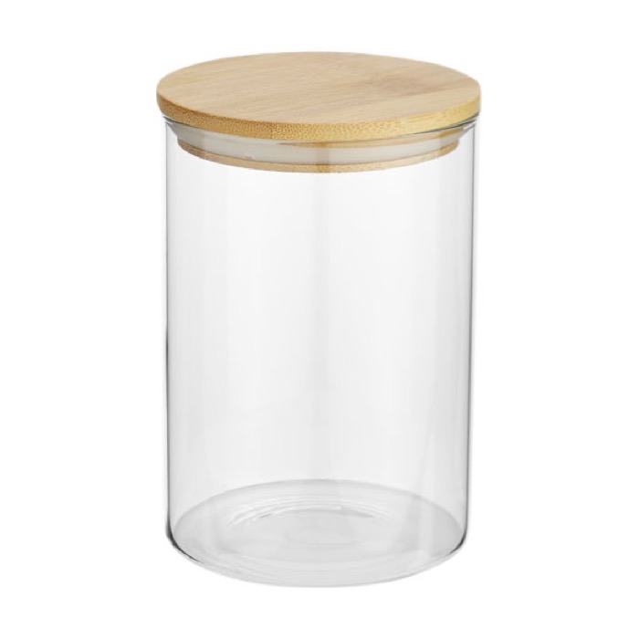 Recipiente para alimentos de tamaño mediano fabricado en vidrio, acompañado de una tapa de bambú. Este práctico tarro de 550 ml es ideal para almacenar alimentos, ya que el vidrio es apto para microondas y lavavajillas, facilitando su uso y limpieza. La tapa de bambú no solo asegura un cierre hermético, sino que también ofrece la posibilidad de personalización con su logotipo a color o mediante grabado láser, ideal para reforzar la identidad de marca. Se presenta en una caja de papel kraft reciclado, subrayando su compromiso con la sostenibilidad. Perfecto para empresas que buscan soluciones prácticas y personalizables para sus necesidades de almacenamiento o como parte de un kit de bienvenida corporativo.