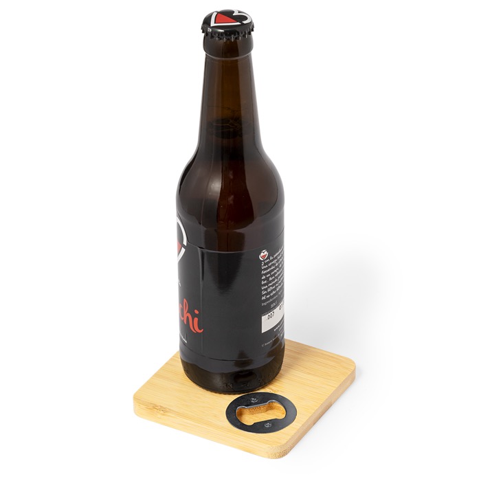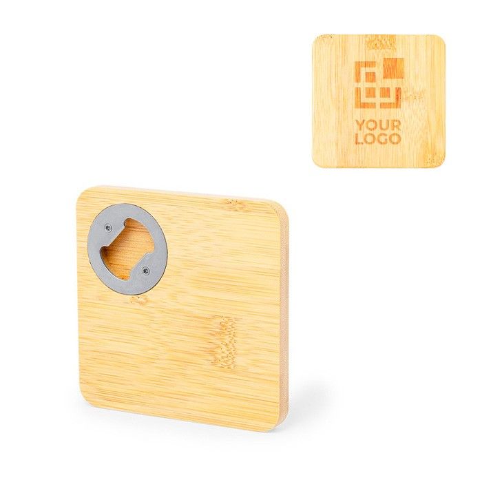 Posavasos cuadrado de bambú con abrebotellas en la esquina