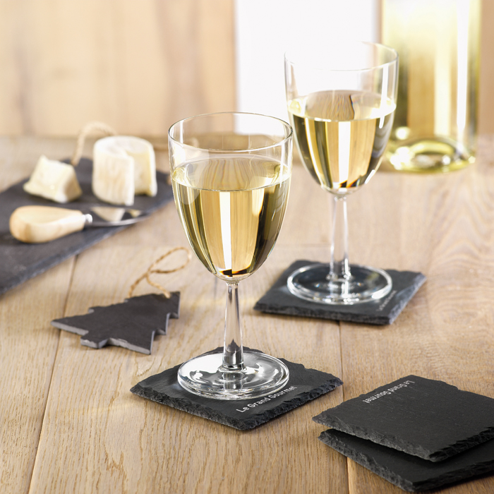 Original set de posavasos publicitarios para regalar a los clientes que están fabricados en pizarra y que tienen una etiqueta donde se puede poner el logo.