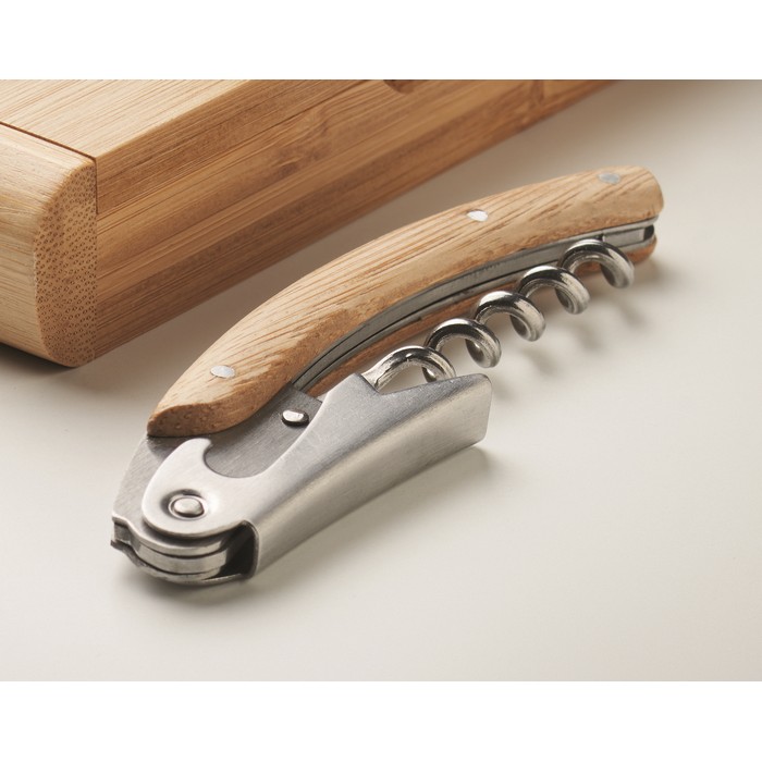 Ofrece una navaja multiherramienta de acero inoxidable con carcasa de bambú. Esta herramienta incluye dos sacacorchos, lo que la hace versátil para diversas situaciones. La superficie de bambú no solo aporta un diseño elegante, sino que también refuerza el compromiso con la sostenibilidad. Tu marca, grabada con distinción, se asocia a la practicidad y al respeto por el medio ambiente. Es un objeto útil tanto para actividades al aire libre como para el día a día, asegurando que tu empresa sea recordada por proporcionar soluciones duraderas.