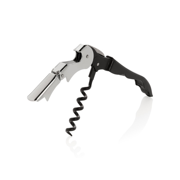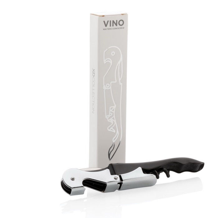 Proporciona un sacacorchos clásico de camarero en acero inoxidable, presentado en una caja de regalo. Este utensilio, con cuchilla de corte de aluminio y levantador de corcho de dos etapas, es una herramienta profesional que garantiza una apertura eficiente y elegante. La inclusión del abrebotellas añade versatilidad, permitiendo su uso en diversas situaciones. Tu marca, asociada a este instrumento tradicional, proyecta una imagen de fiabilidad y experiencia. Es un obsequio valorado por su durabilidad en el sector de la hostelería o en celebraciones, manteniendo tu empresa presente en cada servicio.
