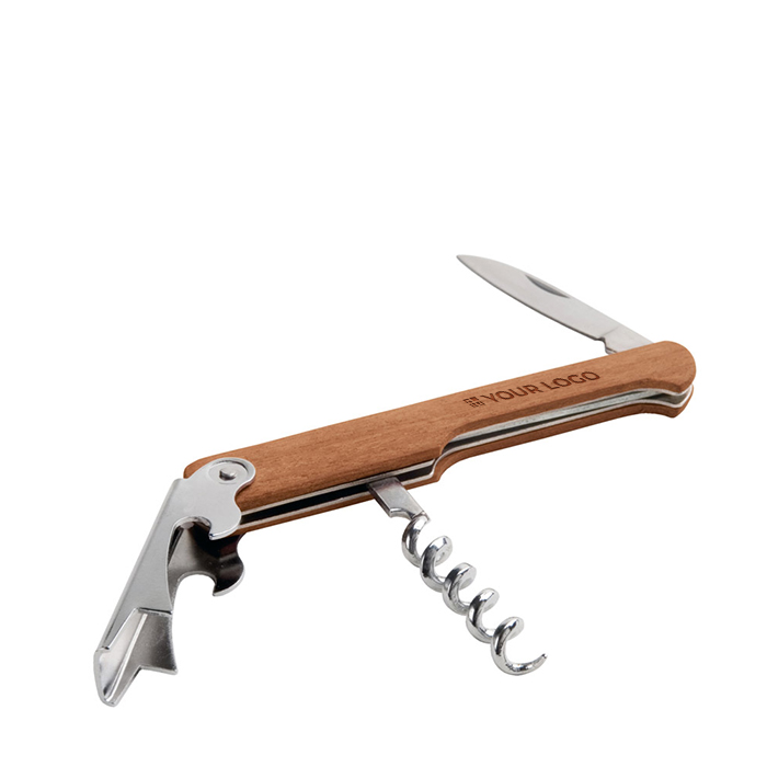 Considera un sacacorchos con mango de madera personalizable y navaja de acero inoxidable, ofreciendo un diseño distintivo. Incluye un abrebotellas y una navaja corta cápsulas, lo que lo hace versátil para diversas ocasiones. Este utensilio combina un estilo clásico con un toque original, siendo práctico tanto para profesionales como para el uso en el hogar. Tu marca, grabada sobre la madera, resalta un compromiso con la calidad y la estética natural. Es un regalo que se distingue por su autenticidad y utilidad, asegurando que tu empresa sea recordada como proveedora de objetos únicos y duraderos.