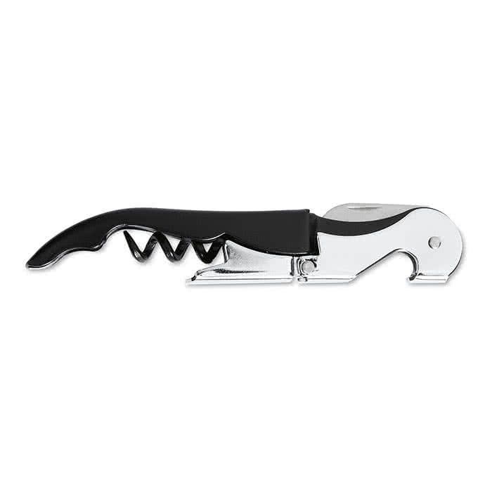 Abrebotellas de dos tiempos, con sacacorchos, fabricado en acero inoxidable. Si tu negocio está enfocado en la restauración o tiene relación con ella no dejes pasar la oportunidad de regalar este artículo tan popular. Es práctico, económico y duradero. Además, podrás personalizarlo a color o con grabado a láser. Está disponible el servicio de transporte rápido, por si necesitas cubrir una necesidad urgente. Por todo ello, este se ha convertido en un merchandising muy popular en nuestro catálogo.
