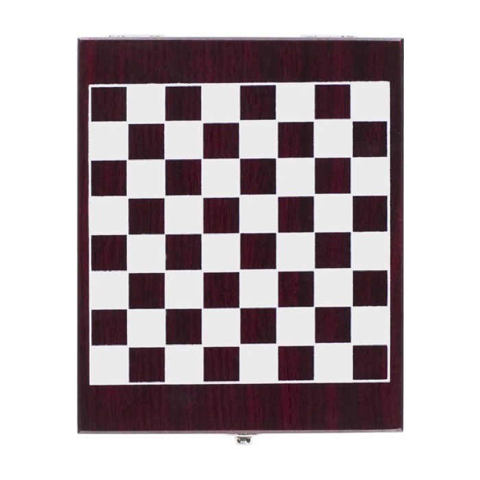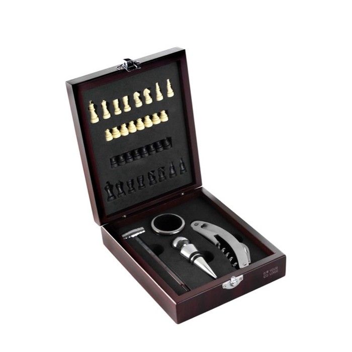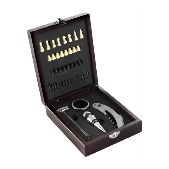 Set de vino en caja de madera para jugar ajedrez en la tapa