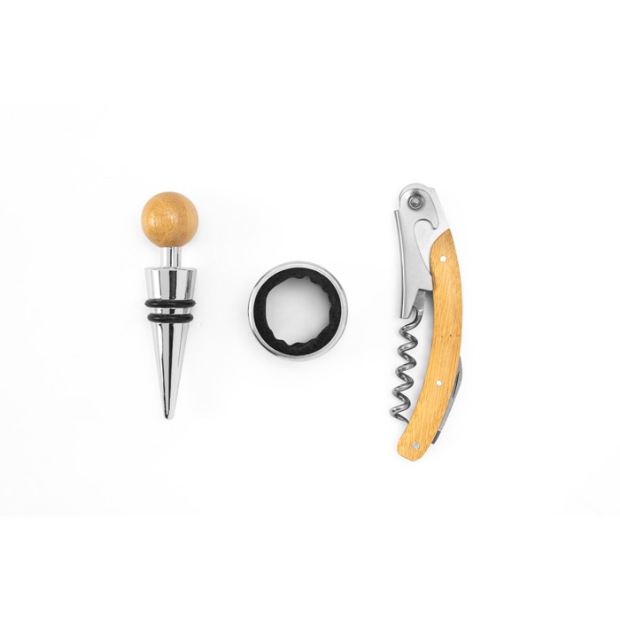 - Set de vino en bambú y acero inoxidable con 3 piezas