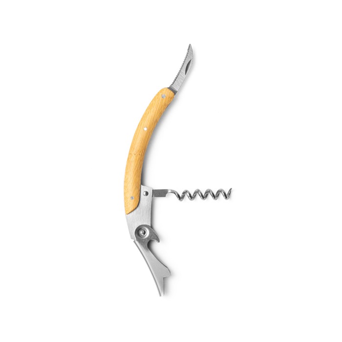 Set de vino de bambú y acero inoxidable pensado para un uso cómodo en catas, comidas de empresa o eventos. Incluye 1 sacacorchos, 1 tapón y 1 anilla metálica para servir sin goteos, todo organizado para tenerlo a mano cuando se necesita. Se entrega en una caja de regalo de papel kraft, lista para entregar en presentaciones. Al estar fabricado con materiales naturales, el color y el estampado pueden variar. Adecuado como detalle corporativo en packs de bienvenida o acciones de fidelización.