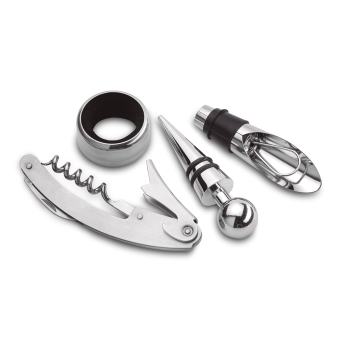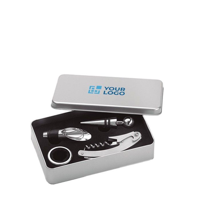 Un completo set de vino que combina elegancia y utilidad. En concreto, este conjunto incluye 4 accesorios que te permitirán abrir, servir y almacenar el vino como un profesional: un sacacorchos, un tapón, un dosificador y un anillo antigoteo. Asimismo, todo el set se presenta en una caja metálica que, al igual que los utensilios que alberga en su interior, está fabricada en acero inoxidable resistente . Tanto la caja como el sacacorchos son personalizables con tu logo, permitiendo que tu marca protagonice cada apertura de una nueva botella. Un regalo ideal para llevar tu estrategia de marketing a otro nivel.