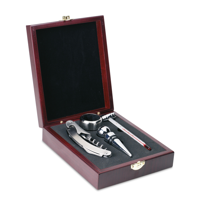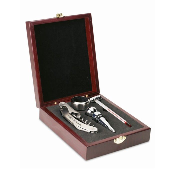 Set de vino personalizado con 4 accesorios en caja de madera Classic