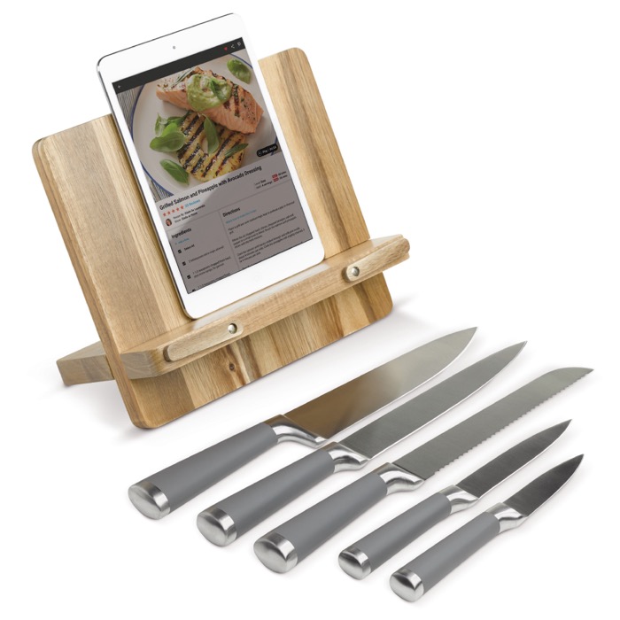 Soporte de madera de acacia para cuchillos y tablet o móvil