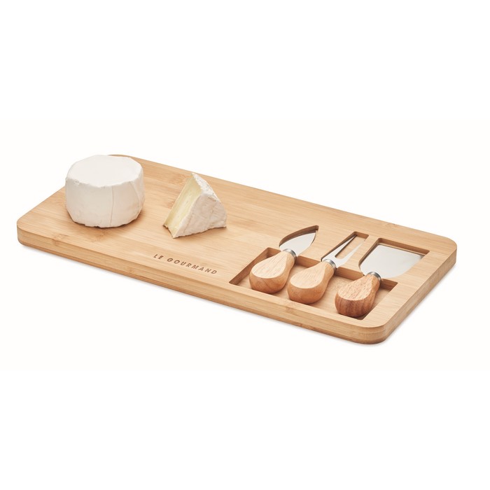 Tabla para servir y cortar que incluye dos cuchillos y un tenedor. Perfecta para eventos gastronómicos en los cuales el queso sea el protagonista.