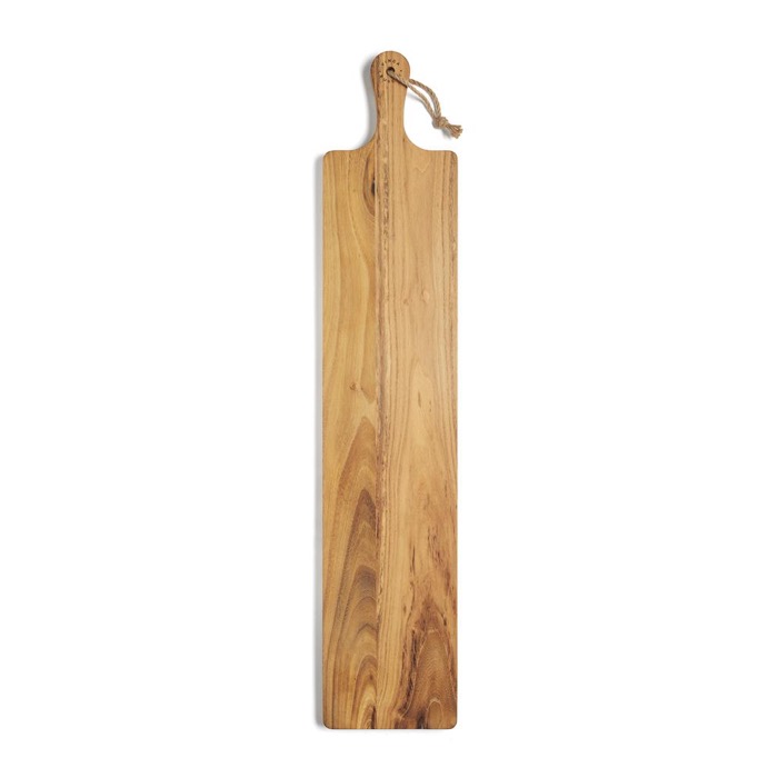 Tabla de cortar/servir robusta y muy manejable que gracias a sus 75 cm de largo y 15 cm de ancho tiene una superficie lo suficientemente grande para ser utilizada tanto para cortar como para servir. El tablero está hecho de teca con certificación FSC y tiene una hermosa superficie de madera de color dorado a marrón medio que se oscurece con el tiempo. El alto contenido de aceite le da al tablero una poderosa protección contra la putrefacción y lo mantiene en buenas condiciones durante mucho tiempo.