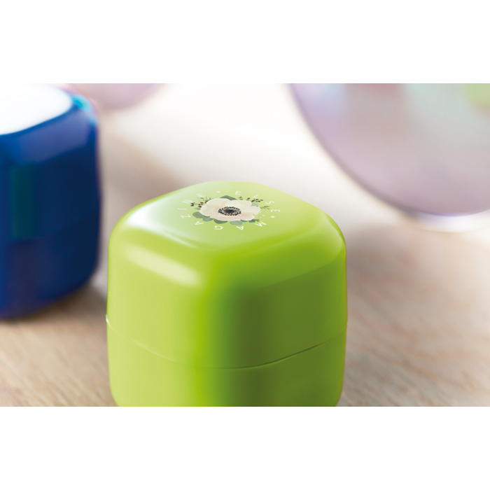 Presenta una bola de bálsamo labial en una caja compacta con FPS 15, un detalle pequeño pero muy distintivo. Este formato original y fácil de transportar asegura que tus clientes lo lleven consigo a diario, garantizando una exposición constante de tu marca. La caja cúbica de ABS añade durabilidad y un toque moderno. Es un obsequio práctico que protege los labios, demostrando tu atención al bienestar de tu público. Dermatológicamente testado, refuerza la imagen de tu empresa como innovadora y cuidadosa, generando un recuerdo positivo y duradero.