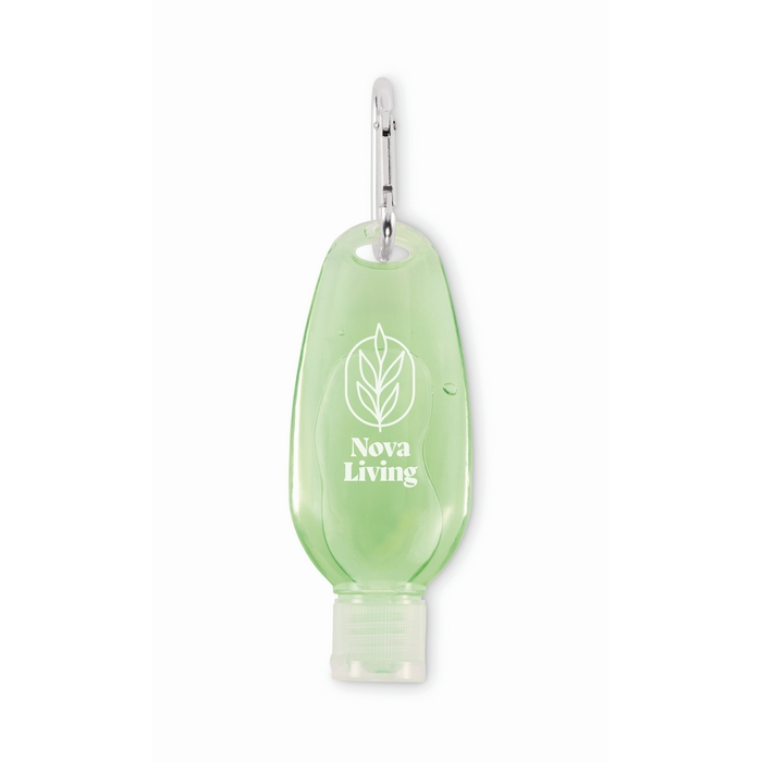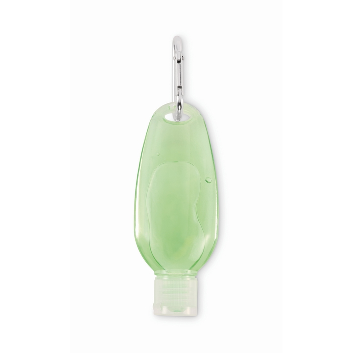 Botella de PET rellenable de 50ml con gel de aloe vera en acabado verde transparente, pensada para llevar en desplazamientos o en el día a día. Incluye tapón abatible de PP para una apertura rápida y un cierre cómodo. El mosquetón de aluminio permite engancharla a mochilas, llaveros o bolsas de trabajo, ayudando a tenerla siempre a mano. Formato compacto, fácil de guardar y de repartir en acciones. Útil como detalle en viajes corporativos o eventos.