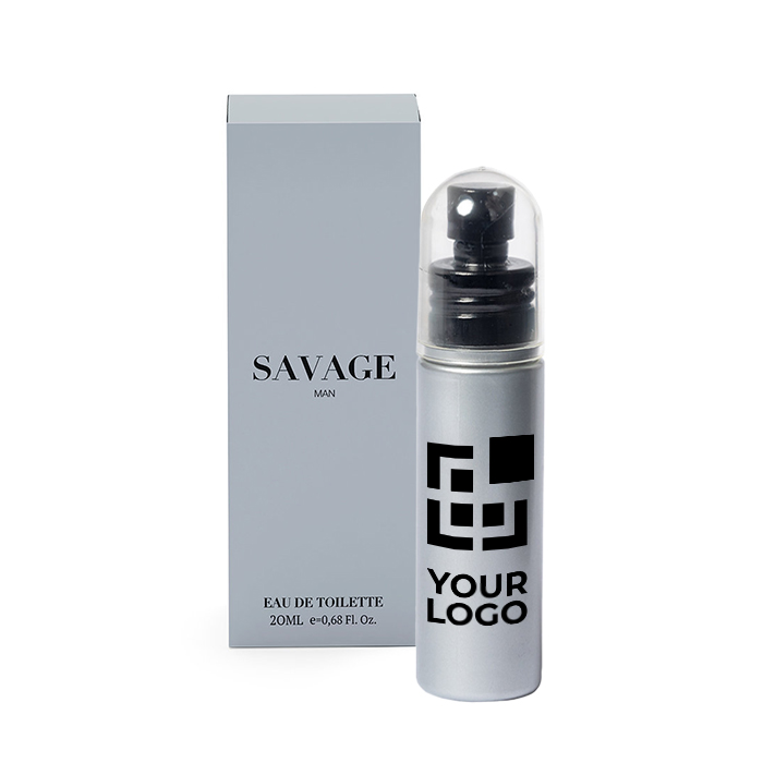Regala olores con el fin de que tu marca apele directamente a uno de los cinco sentidos, facilitando que se genere un recuerdo agradable y más emocional alrededor de tu compañía. En concreto, te sugerimos que apuestes por añadir a tu merchandising y obsequios publicitarios "Savage", un eau de toilette para hombre. Este se distingue por sus matices amaderados y su presentación en spray rellenable de 20 ml con tapón transparente. Fabricado en plástico, el recipiente es perfectamente personalizable mediante serigrafía. Un producto hecho en Europa que se presenta en una caja de diseño premium, demostrando desde un primer vistazo que se trata de un detalle cuidado y lleno de senetimiento.